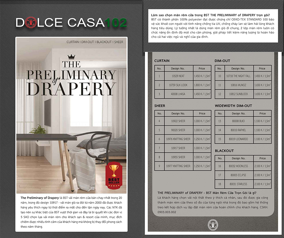 The Preliminary of Drapery là BST vải màn rèm cửa bán chạy nhất trong 20 năm, trong đó design 10917 – vải màn gió ra đời từ năm 2000 đã được khách hàng yêu thích ngay từ thời điểm ra mắt cho đến tận ngày nay. Các NTK đã tạo nên sự khác biệt của BST vượt thời gian và đây là bí quyết khi các đơn vị 5 SAO chọn lựa vải màn rèm cho khách sạn & resort của mình, mục đích chiếm được nhiều tình cảm của khách hàng mà không bị thay đổi phong cách theo năm tháng.